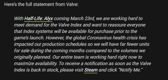 V社声明称:“随着《半条命:Alyx》3月23日的发售日越来越近,我们也在努力满足玩家们对Valve Index套件的需求,并且希望能够向所有玩家保证能够在游戏发售前买到Index。