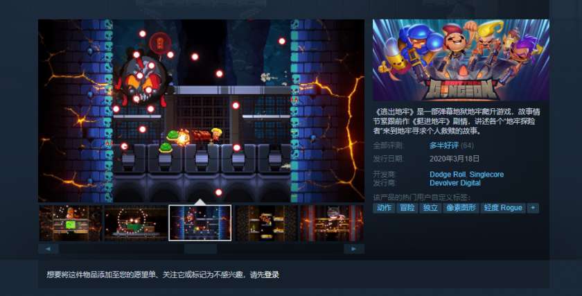 目前该作Steam国区售价37人民币,评价为多半好评。《逃出地牢》是一部弹幕地狱地牢爬升游戏,故事情节紧跟前作《挺进地牢》剧情,讲述各个“地牢探险者”来到地牢寻求个人救赎的故事。想知道更多游戏资讯可点击PK手游网了解!