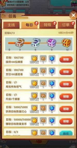 在订单中可以看到顾客的订单要求,安排厨娘制作后就可以领取订单的奖励,奖励中一般都会包含钻石;
