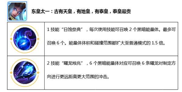在王者荣耀中,东皇太一召唤6个球的模式是觉醒之战的模式,在觉醒之战模式中东皇太一1技能“日蚀祭典”每次使用技能可召唤2个黑暗能量体,最多可召唤6个,并且能量体体积和碰撞范围都扩大至普通模式的1.5倍。