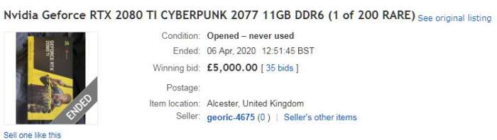 近日首批抽奖获得《赛博朋克2077》2080ti限量版显卡的幸运儿出现,有些人在中奖后跑在eBay上转手拍卖这款显卡。在德国有玩家开出5000欧元售价,在美国有人开出4250美元售价。最离谱的是在英国有人拍卖这款显卡,经过多次竞拍,某玩家以5000英镑(折合人民币4.3万元)价格购得该显卡。