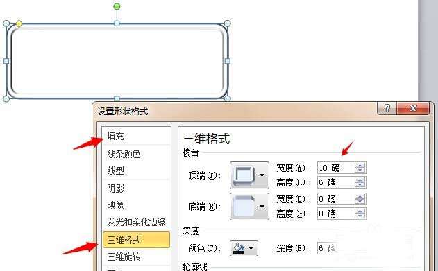 1、在编辑区域绘制一个“圆角矩形”,并将其三维格式设置为图中所示的样式,