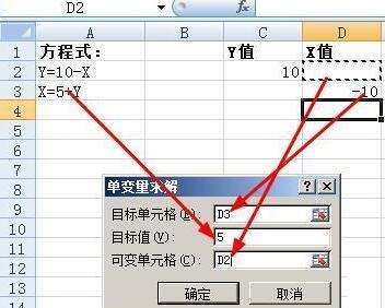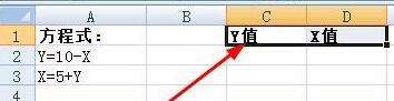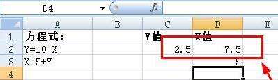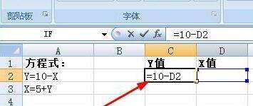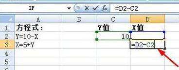 3、用第一个公式Y=10-x,建立C2单元格的公式:=10-D2