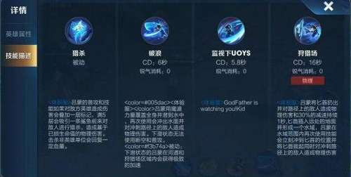 被动技能:吕蒙的普攻和技能对敌方英雄造成伤害可叠加一层印记,满5层会吸引一条鲨鱼进行猎杀,造成已损生命的物理伤害,另外击杀非英雄单位会恢复血量。利用印记叠加伤害,预计出装会以攻速为主,另外击杀非英雄会回复血量,很明显,这个英雄定位将是一位强力打野。一技能:潜到水中,再次使用会冲出睡眠并对冲刺路径上的敌人造成物理伤害,下潜的状态无法使用断空(可能是二技能)和普攻,下潜状态的吕蒙,在河道和大招范围内会获得极致加速。河道英雄终于来了,因为河道有水,这次终于利用上了,在河道中会获得超高的移动速度,算是他的主宰区域,因此这个英雄比较适合游走。二技能还未做好,因此没有技能介绍。大招:将匕首丢出去,对命中的目标造成伤害和减速,并形成一个水域,再次使用会冲锋到匕首处,对路径目标造成伤害。