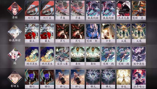 阵容名: 清姬 无名之毒 (1) 觉醒·清姬 (1) 蛇行击 (2) 淬毒 (2) 氤氲蛇姬 (2) 铃鹿御前 义道 (2) 霸主 (2) 冥弓 (2) 觉醒·铃鹿御前 (1) 归乡 (1) 鸩 致命诱惑 (1) 鸩羽苏生 (2) 寂寥心象 (1) 毒蚀 (2) 觉醒·鸩 (2) 青坊主 法界唯心 (1) 舍生 (1) 佛印 (2) 禅心 (2) 佛光 (2)