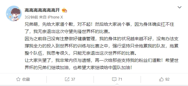 《守望先锋》世界杯2019中国代表队选手Leave今天在微博发布消息,宣布因身体原因,自己将退出今年的国家队。本届世界杯中国队将以六人阵容出战。
