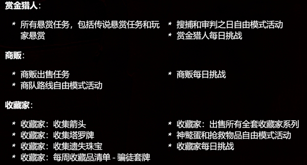 本周,所有在《荒野大镖客Online》中游戏的玩家,都可在一大堆活动中获得额外的2000俱乐部经验值以及30%俱乐部经验值加成,借此玩家们可更快地推进惠勒劳森公司俱乐部和亡命之徒通行证进度,包括: