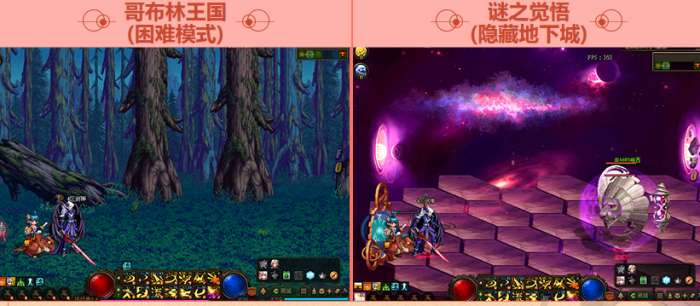 进入地下城后,会随机从巴卡尔之城、蠕动之城、黑色大地、悲鸣洞穴随机出现一个,困难模式会追加哥布林王国,普通和困难模式都有一定机率进入特别的隐藏地下城。