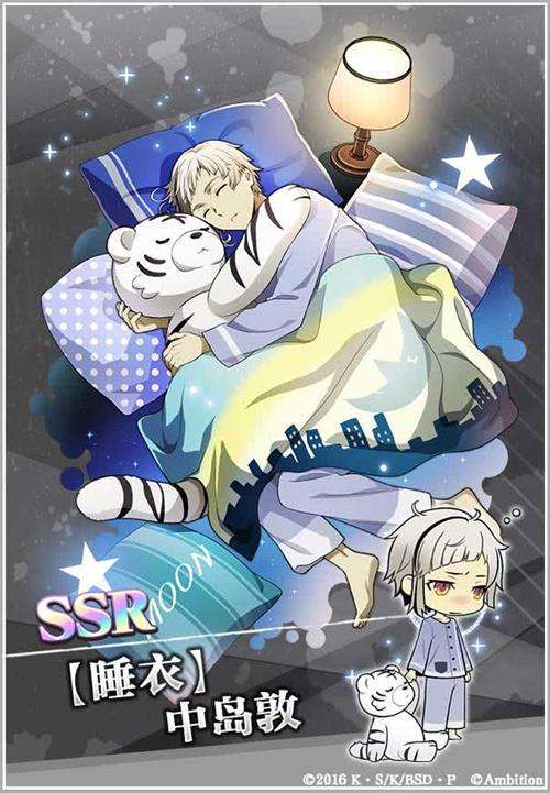 “睡衣”活动即将复刻,这张可爱的睡衣敦仔不知道大家还记得吗?画面上的中岛敦结束了一天的工作,正抱着大白虎玩偶入睡。这张卡在战斗时的小人形象是睡眼惺忪的中岛敦拎着小老虎,很是能戳人萌点。