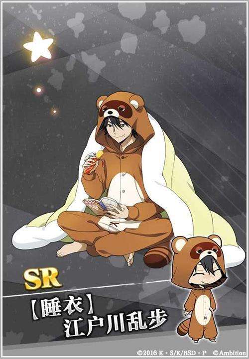 江户川则是穿着狸猫形象的睡衣,钻在被窝里边吃点心边看书,还真是的蛮符合他随性自然的生活态度。总是眯眯眼形象的乱步桑在这张卡的立绘上难得地睁开了眼睛,不过小人形象还依然是笑眯眯的。身后的狸猫尾巴更是为这张卡添加了几分萌点,你会喜欢这样的名侦探吗?