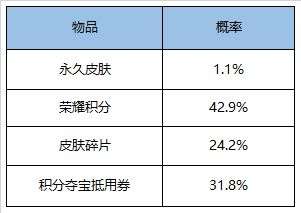 打开后必得皮肤碎片*2、铭文碎片*100和皮肤体验卡(7日)1张:鲁班七号-电玩小子、诸葛亮-黄金分割率、百里守约-特工魅影、吕布-末日机甲其中之一