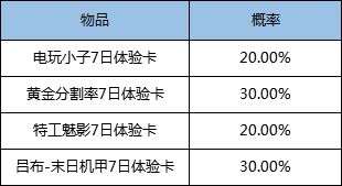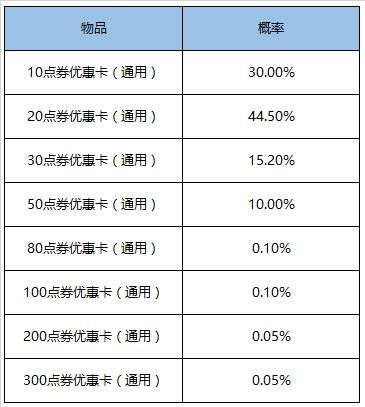 打开后可随机获得10/20/30/50/80点券优惠卡(满288点券可用)、100/200点券优惠卡(满688点券可用)、300点券优惠卡(满1688点券可用)其一,赠送索要/神秘商店/模拟战/礼包等不可用,6月30日过期。
