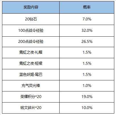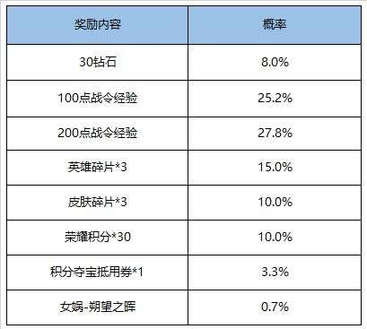 【KPL应援宝箱】:打开后可随机获得以下奖励之一:铭文碎片*5、钻石*5、永久英雄/1日英雄体验卡(马超、张飞、马可波罗、周瑜、裴擒虎)、1日皮肤体验卡(幸存者、五福同心、激情绿茵、海军大将、街头旋风)。