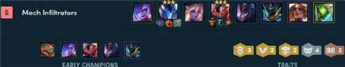 机神刺的阵容在前两个版本仅仅只能位于A级,但是前些版本的刺客加强让机神刺的体系表现开始提升,10.11版本刺客羁绊再度小改小加强,让机神刺重回S级。阵容在六级可以小D一波,但是D牌的节奏不要太快,六级如果能D出菲兹就可以直接上七,这个阶段上出的四刺基本是能轻松在中期锁血。七级以后要大D,目标是尽量追出三星兰博、三星卡莎,但是如果六级D不出鱼人的话就先稳扎稳打过渡,等上七以后再考虑把牌给搜出来。