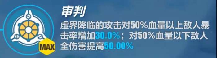 全伤减免进一步提升空之律者抗流血能力(反正女王不会被怪打到),配合角色自带45%降低间接物理伤害,最终减伤为56%。破盾强化覆盖女王所有伤害,一定程度上解决了原来大量爆发伤害被盾条削弱的问题,配合主动技能双破盾加持,让女王的破盾能力在所有物理输出角色中来到上乘水平。