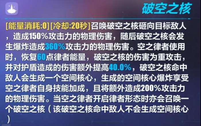 一般该技能在响指之后直接释放进行破盾或者打伤害。响指会生成1个破空之核(大球),主动会生成1个破空之核(大球)+1个空间核心(小球)。除去响指部分,合计倍率为