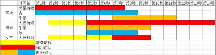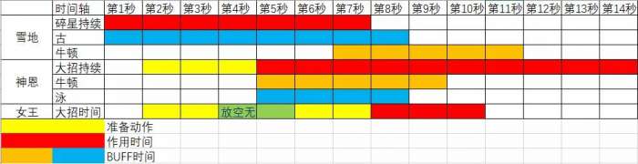 可以看出,女王大招吃4个BUFF(雪地古、牛,神恩泳、牛)的时间都非常极限,甚至已经吃不全,这还是认为神恩出场瞬间完成开大+十字架的动作并瞬间换出女王开大,并且操作紧凑到没有一点时间浪费的情况 。实际使用中因为操作误差等种种因素,碎星上牛可能会提前,女王大招开出来的时间会延后。假如把女王输出轴整体向后推移1秒,结果就是大招1/3的伤害,也就是约1000%倍率要少吃1古1泳1牛的加成。所以有些女王流程(BV1Fz4y1d7wZ 276能级物伤地藏幽色S女王723分),很多时候会因为0.几秒的操作误差丢失一两条血的伤害。全BUFF大招一跳 25w+,少BUFF直接变成十几w,一跳差出十万伤害,两三跳就相当于大招少打了一下,带来的伤害差距可想而知。