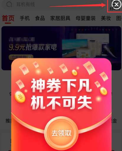 在弹出的“神券下凡机不可失”提示信息页点击“去领取”或不去领券就点击右上角“X”。见下图