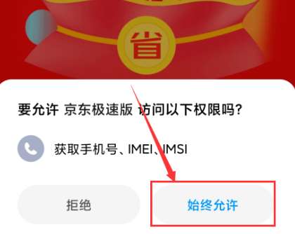 在“获取手机号、IMEI、IMSI”权限提示对话框上,点击“始终允许”。见下图