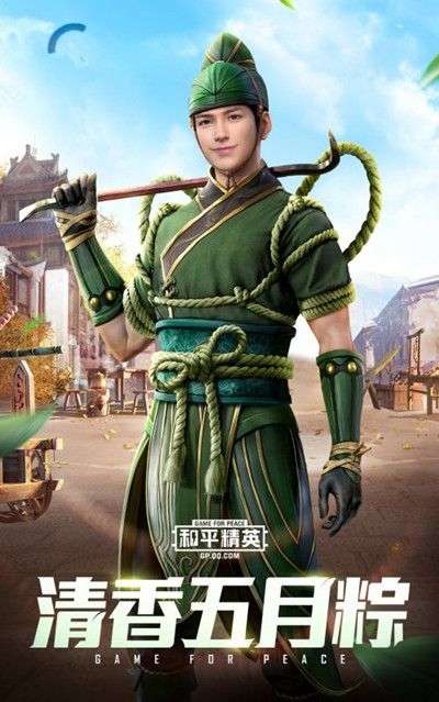 这套时装是端午节的主打套装,整体就一个感觉,绿!女性角色的清香五月粽套装说实话有点丑,脑袋上扣了一个粽叶,头发也是未经打理的样子,十分失礼。反倒是男性角色的这套时装颜值颇高。衣服造型略微像是关二爷的打扮,并且颜色也是十分的相似,如果不是没有美髯,白发差点就以为是关二爷穿越到和平精英当中了。
