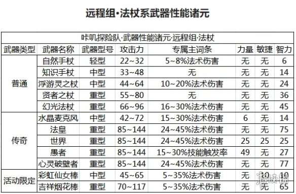 法杖系武器在远程组武器中,基本攻击力上限高于弓,下限为同组最高值。