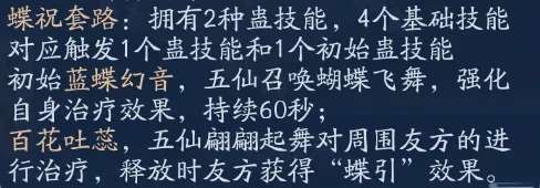 五仙引入了“蛊”的机制,从游戏中的官方技能说明来看有点复杂,但是简单说起来,就是通过1-4号位技能的释放,来改变五号位技能的状态,以获取更多的治疗手段。