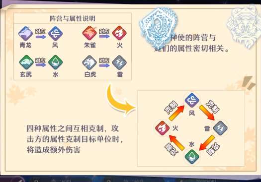 青龙阵营对应风;朱雀阵营对应火;玄武阵营对应水;白虎阵营对应雷