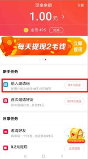 2、点击输入邀请码进入到【邀请码】页面。输入上面给出的邀请码 269104612 就可以立即获得1元现金奖励。