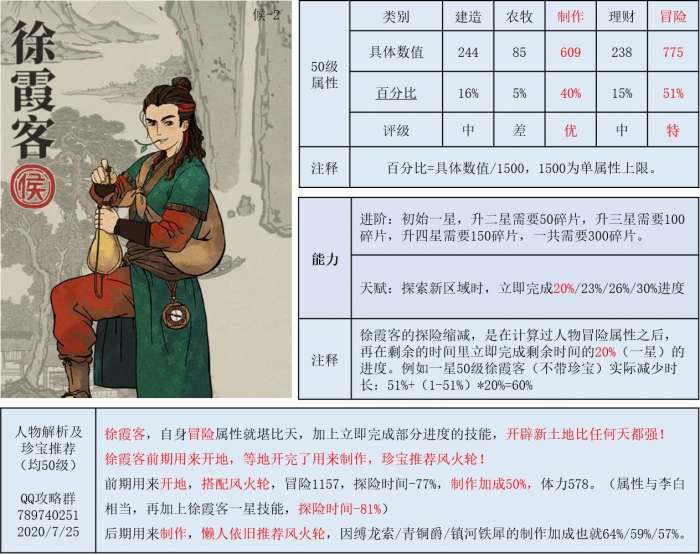 前期用来开地,搭配风火轮,冒险1157,探险时间-77%,制作加成50%,体力578。(属性与李白相当,再加上徐霞客一星技能, 探险时间-81%)
