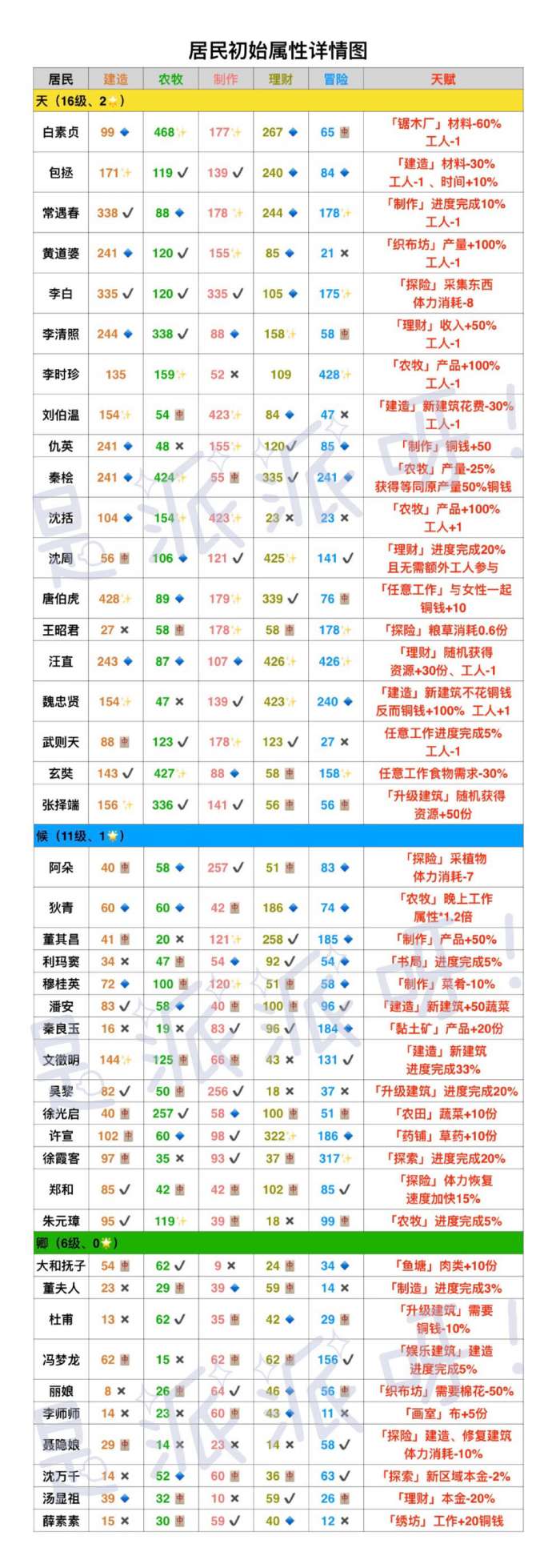 包括了:天、侯、卿三个级别所有人物的初始属性,具体数值大家请看下图。
