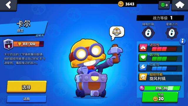 在8月的整体强度排行中,雪人老爷爷格尔以21分位列榜首,"版本之子"瑟奇以20分排在第二。而矿工卡尔竟然同样以20分与瑟奇"平分秋色",可谓是非常强力了。除了双人吃鸡和赏金猎人模式,其他模式卡尔的评分都是S级。三人模式中的他靠着回旋镖能够在边路压制一切敌人,超级技能用于保护队友撤退或是突然袭击。双人吃鸡中能够依靠障碍物快速打掉资源箱子,时不时投出的矿工镐不管是谁都吃不消,最强黑马名副其实!