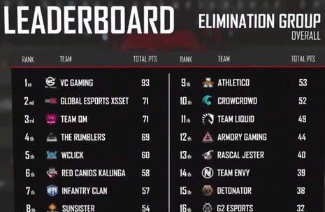 相比4AM的稳定发挥,VC、IFTY和QM三支战队在小组赛的首战状态欠佳,总积分没有进入所在小组的前八名,憾失直接晋级半决赛的资格,不得不进入到小组淘汰赛。由于在小组赛第一战的积分可以延续到淘汰赛环节,在淘汰赛开始之前,VC和IFTY便占据了积分榜首和第三名的优势,为赢得后的晋级资格奠定了夯实的基础。而QM战队积分较少,排在第 13位。在淘汰赛第一场比赛中,VC战队便顺利获胜,开了一个好头。前三场比赛结束之后,VC战队的总积分已经突破70分,终以积分榜首的战绩稳稳锁定了半决赛的门票。在淘汰赛初期落后的QM战队也开启了疯狂追分模式,重现了自己在PCM赛事上的光辉时刻,通过六场比赛成功将自己的总积分提升到积分榜的第 三名,顺利晋级半决赛。IFTY战队在后的关键局中凭借着“老菊”的优异发挥,稳住了积分排名,获得了积分榜的第七位,有惊无险地搭上了晋级半决赛的末班车。