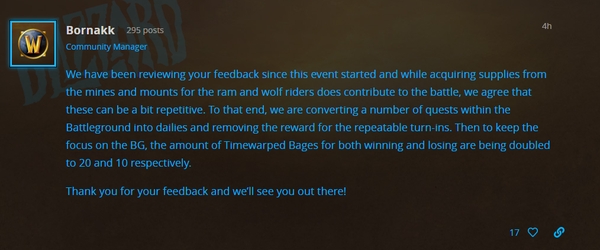 以下为公告内容:自从这个事件开始以来我们一直在阅读你们的反馈。尽管从矿和坐骑获得补给品来获得雷矛军用山羊和霜狼咆哮者对战场也有贡献,但我们同意这样做的重复性有点高。为了解决这个问题,我们把战场中的一些任务转变为日常任务,并移除了重复上交任务物品的奖励。为了让玩家把关注点放在战场本身,在战场中胜利或失败所获得的时空扭曲徽章翻倍至20个和10个。