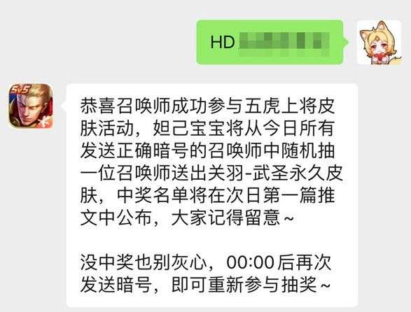 9月27日-10月8日,在公众号后台发送HD暗号(提示:暗号有5字,可从任务二中获得),即可参与抽奖,妲己宝宝每天将抽取幸运召唤师,送出好礼,每天都可参与一次)