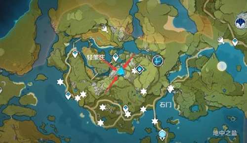 三、村长会让你找另外碎片,分别是岩尊像很多的地方和最高处,岩尊像在轻策庄西边,如下图;