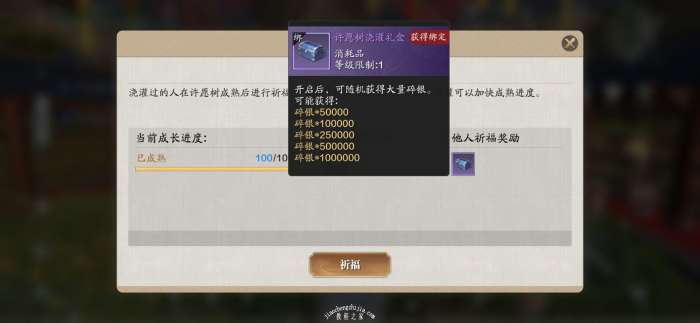 许愿树的主任会获得一个非常丰盛的奖励,其中有帮派功勋令、紫色心法残页以及稀有养成材料,而浇水的路人则可以获得大量碎银奖励,其中的碎银奖励档次分别为5万、10万、25万、50万和100万,如果运气好能够开到100万碎银,那也算是赚大发了。
