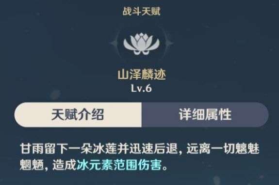 甘雨二段蓄力发射霜华矢或霜华绽放命中敌人后减少敌人冰元素抗性,该天赋简单粗暴的讲就是提高甘雨作为主c的伤害。