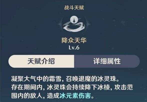 处于甘雨元素爆发领域内的当前角色获得20%冰属性伤害加成,该天赋无论是作为主c还是副c都非常强大,后续版本配合神里打副c的话......未来可期。