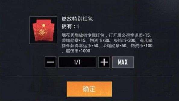烟花秀燃放放者专属红包,打开后必得幸运币*15、荣耀勋章*15、物资币*30、服饰币*3000。有几率额外获得幸运币*50、荣耀勋章*50、物资币*100、服饰币*1000。