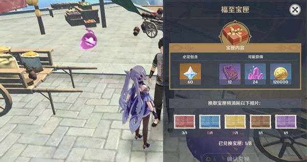 使用“留影机”拍摄指定对象时,可随机获得不同颜色的“相片”。集齐五种颜色的相片后,至多可以换取8个“福至宝匣”。每开启一个宝匣都将获得原石加三选一随机素材的奖励。