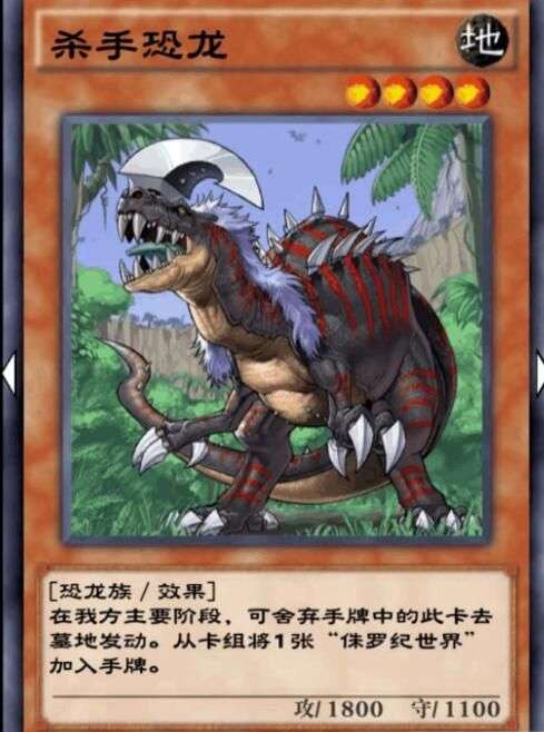 在介绍恐龙卡组之前我们先说一下恐龙卡组的优点和缺点,在我看来主要有两点优势:其—是杀手恐龙和暗黑腕龙在场地加成下高达2100的打点,超越了现环境中魔法斧王的2000、白龙的1800和吸血鬼的2050,是除场地加成下的牛头鬼之外的最高下级打点。第二个优势是系统内优秀的单卡,化石调查和暗黑腕龙被物理限—,这两张可以说是放满能统治环境的存在,暗黑三角龙有着本环境内罕有的穿防效果,对削卡等阴间卡组有着很大的优势。而说到缺点,恐龙卡组的最大缺点就是对场地依赖程度大,—旦侏罗纪世界被鹰身狩猎场或帝国等环境内常见的魔陷破坏卡去除,我们的杀手恐龙就变成了1800的白板,任人宰割。还有一点和现阶段很多beat卡组一样,卡组的上限很大程度上是由红坑等优质单卡的强度决定,这一点是现阶段无法避免的。