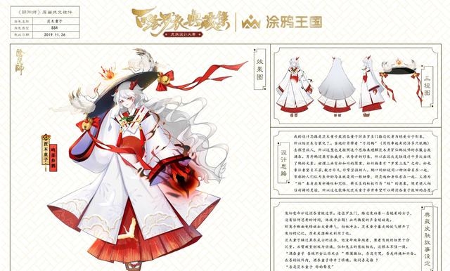 看似娇小玲 珑的身材下隐藏着强大的妖力,裙摆处的松竹绣绘象征着坚贞不屈和毅力非凡。胸口的松枝用纽带系在一起,源于京都的人们认为生命的存在就是用纽带将其系紧就如同自己的身体和灵魂紧密相连。这样细节满满又不失大体的设计足以看出创作者的用心,和对于茨木童子这个角色的喜爱。