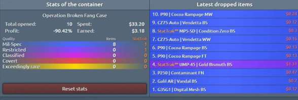 左边的是一些数据,上下左右顺序依次是:箱子名称,开箱次数,花费金额,比例(是正数代表赚了,负数代表亏了)和获得金额。再下面是级别,看颜色可以看出来吧。