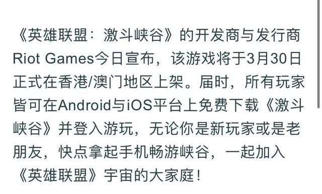 3月30日LOL手游将在中国香港、澳门地区上架,届时所有玩家都可以在安卓、ios平台免费下载并登入游玩。