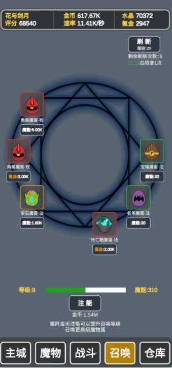 ②魔石:作用于主城-魔王核心进阶(不同阶级可对应开放不同建筑物)③氮金:作用于召唤功能中购买魔蛋及主城-孵化室孵化魔蛋可加速④进化石:作用于魔物等级突破(每升级20级需要突破一次)