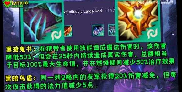 当携带者使用技能造成魔法伤害时,该伤害会降低50%,但是会在25秒内持续造成真实伤害,总额相当于目标100%的最大生命值,并在燃烧期间其减少50%的治疗效果。