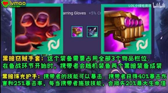 此装备需要占用全部3个物品栏位,在备战环节开始时,携带者会随机装备两个黑暗装备的成装。