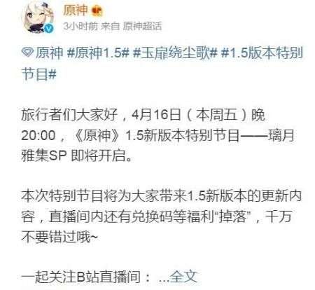 原神官博:旅行者们大家好,4月16日(本周五)晚20:00,《原神》1.5新版本特别节目——璃月雅集SP 即将开启。