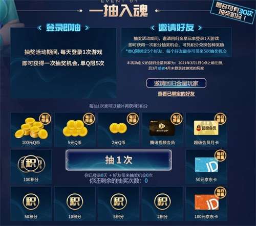 2、活动期间,邀请回归金星玩家登录1天游戏,可获得1次积分抽奖机会。单Q限绑定5个好友,每个好友最多可带来5次抽奖机会。