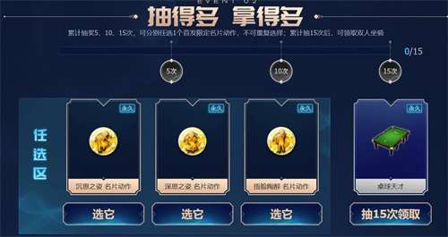 累计抽奖5、10、15次,可分别任选1个首发限定名片动作,不可重复选择;累计抽15次后,可领取双人坐骑。